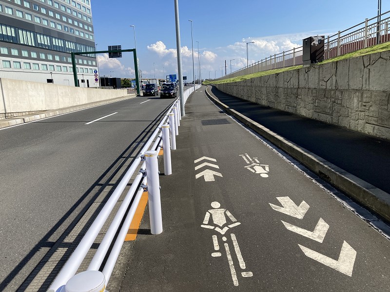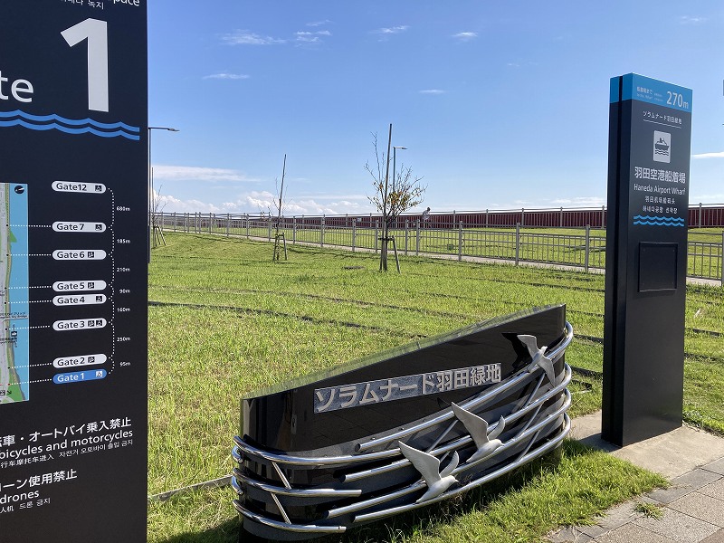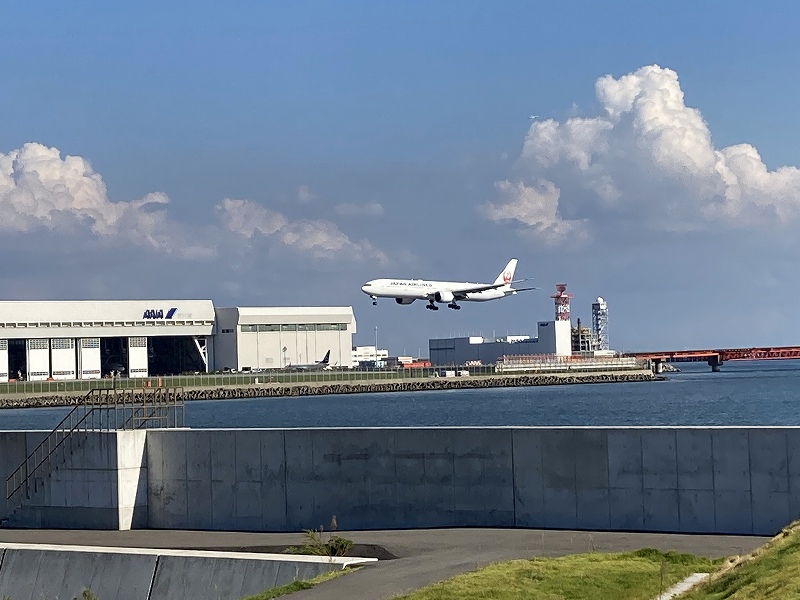 第三ターミナルの足湯でのんびりした後、第一ターミナルの向こうまで行けそうなので堤防に近づくと「ソラムナード羽田緑地」という歩行者専用堤防が続いてます。自転車も走行禁止なので押し歩きです。たどり着いた場所にはカメラマンがいっぱい(笑)