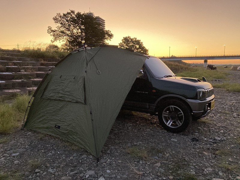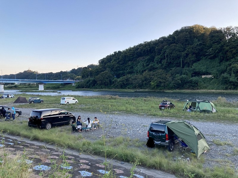 大物は車に常備しているので、刃物や食料品を積み込むだけで行けます。お肉を切らしていたのとジンのスキットルを忘れたのでマルエツで調達しました。高田橋多目的広場は前回よりテントがいっぱいあったけど、橋の上流側はそうでもなかったのでいい場所にジムニーを止めることが出来ました。ちょうどトイレに一番近い場所だったのでラッキー。