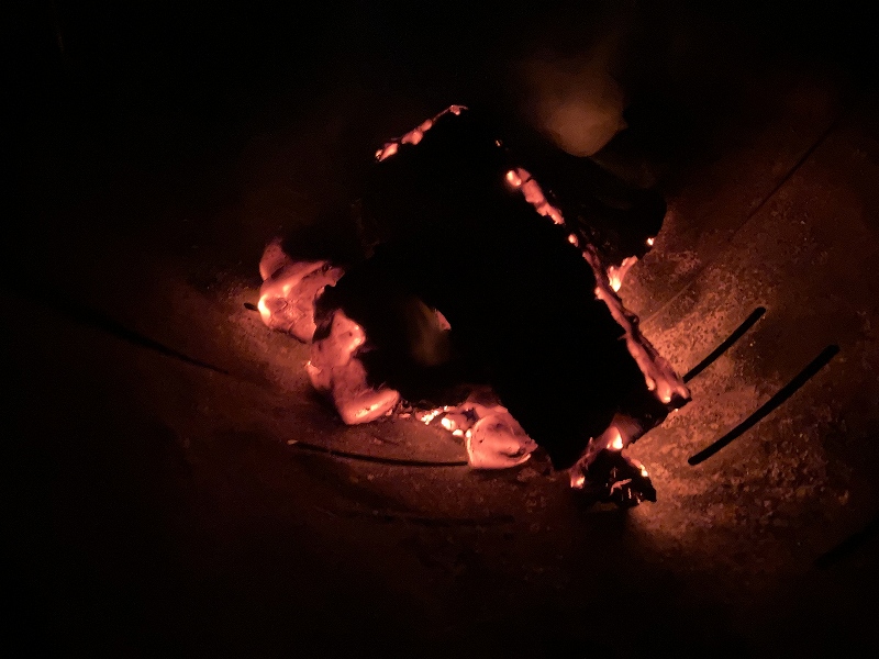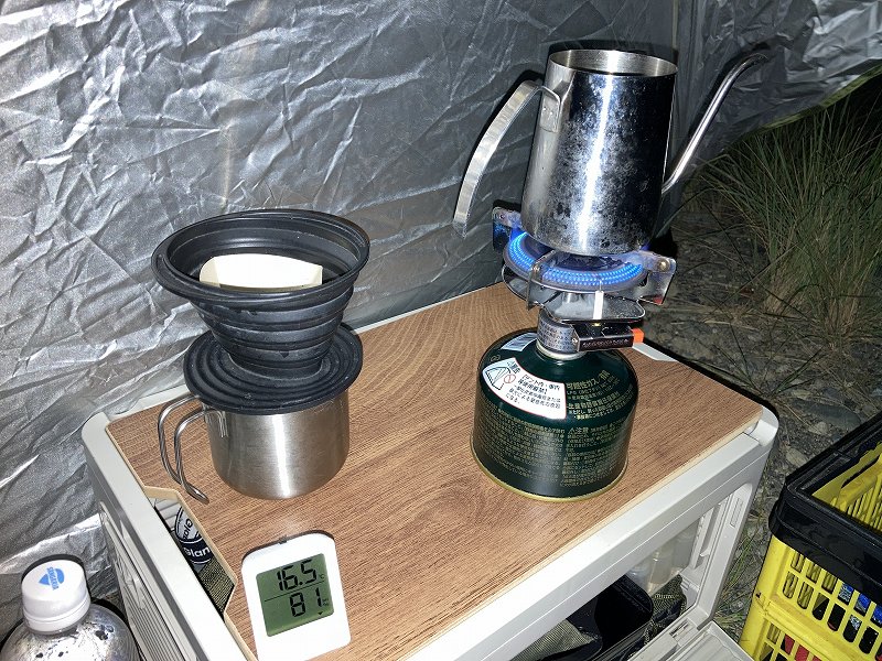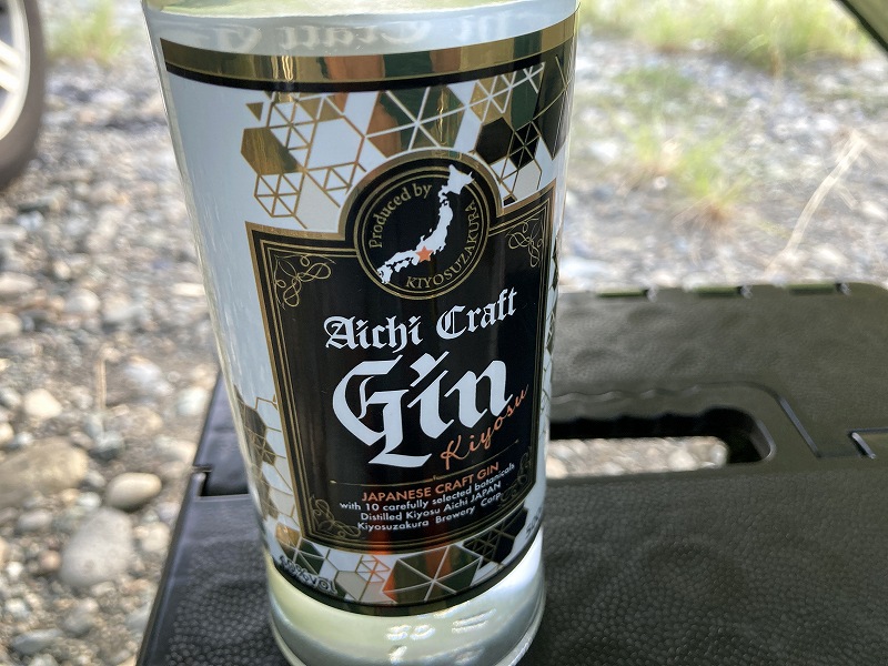 ここはトイレが7時〜19時までしか使えないので、18時くらいまでにビールと食事は済ませてしまったほうがいいですね。そのあとは愛知県のクラフトジンをチビチビ飲んで、焚火が熾火になったら就寝時間です。結局、16度まで下がったので外はかなり寒かった!
