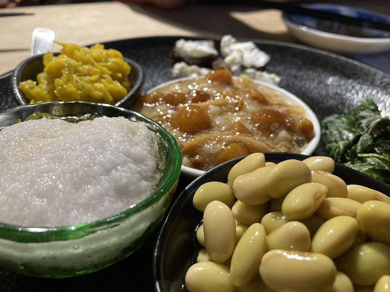東北の6種盛りですね。いぶりがっこのクリームチーズ乗せ、しそ巻、なめこ+そばの実、とろろ+?、菊の花の酢の物、、豆ですね。しそ巻が美味しかった!
