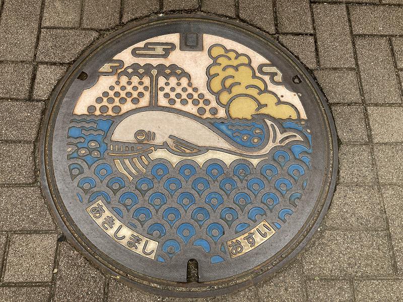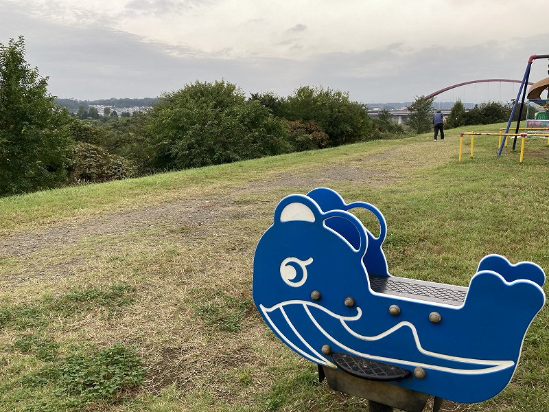 近くのマンホールや駅までの道標もくじらモチーフです。くじらメニューとかあるのかな?イートインもできるスペースがあったけど河原でのんびりしたいので少し走っていると公園の遊具もくじらモチーフ!