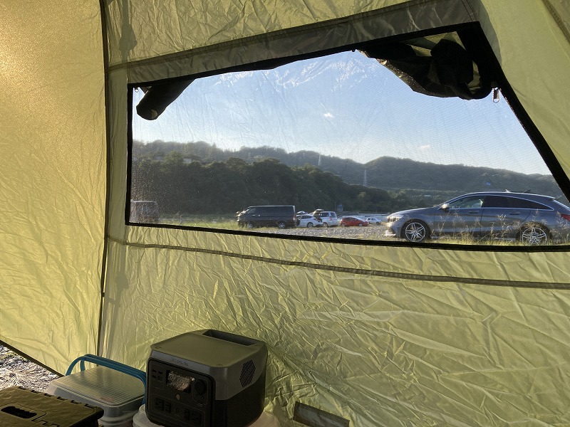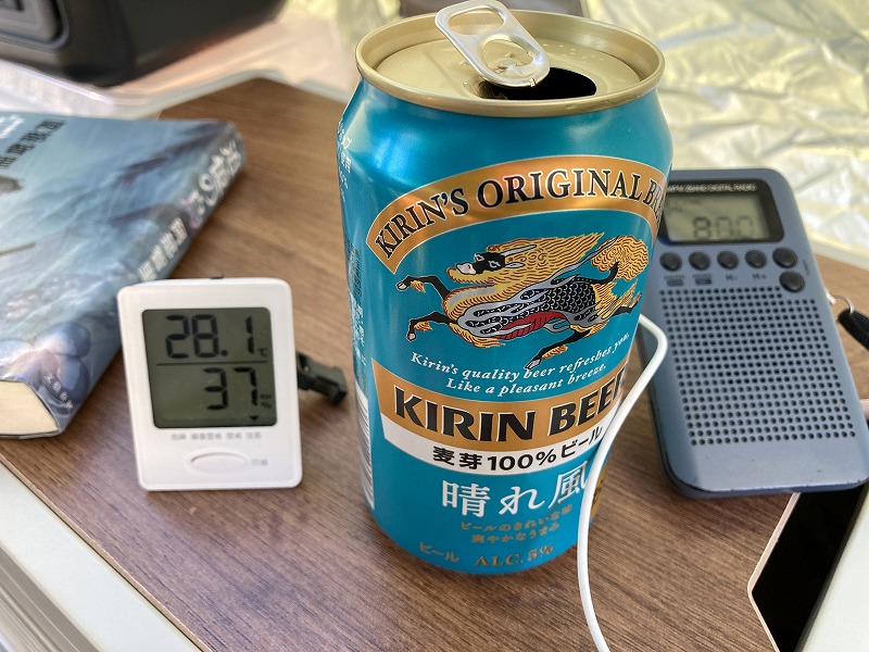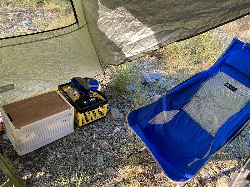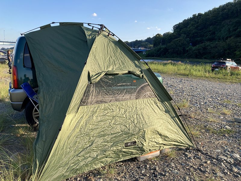 とりあえずカーサイドタープを設置して荷物を下ろしてから、車内を車中泊仕様にします。テントとタープを一から設置しなくていいだけでめちゃくちゃラクチンですね。いきなりビール呑んでもいい感じです。ちょっと昼寝しちゃいました。