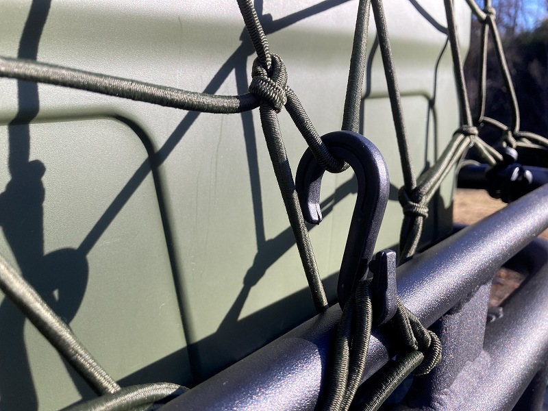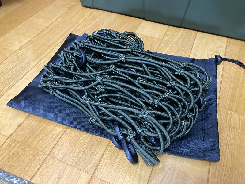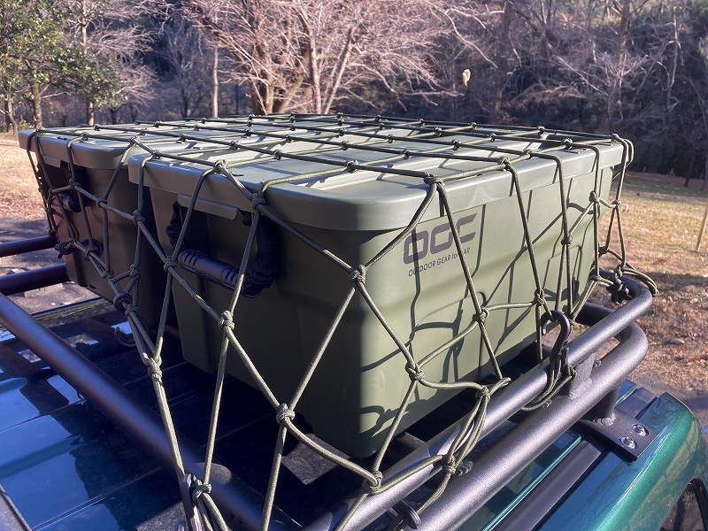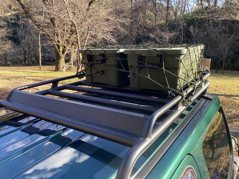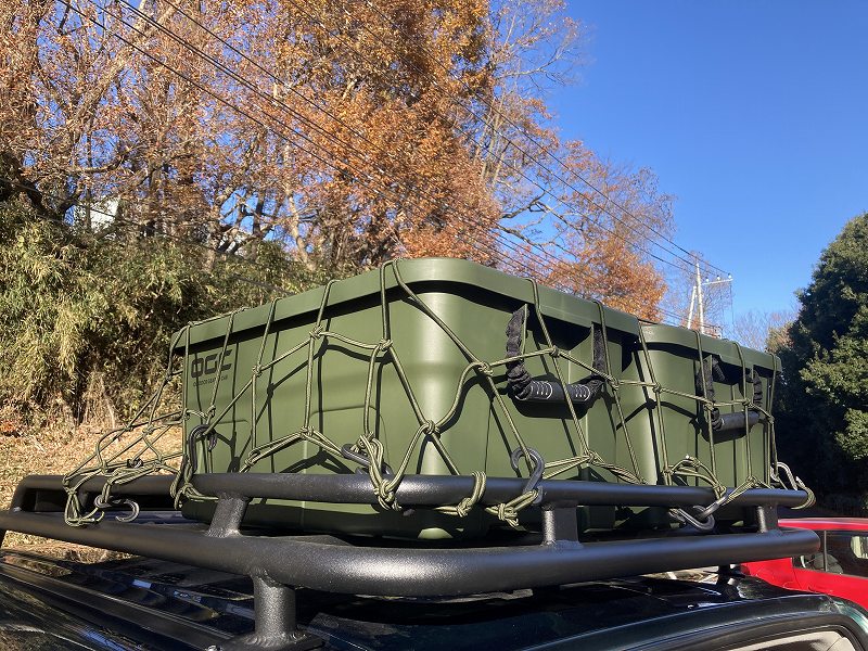 ルーフラックに載せたものをラゲッジカーゴネットで止められるかも確認しておきましたがいい感じですね。スペース的には半分も使ってないので薪と調理器具も載せてしまえます。フックが小さくてルーフラックのバーに掛からないので工夫してます。走行するときはラチェット式ベルトを使うので飛んでいくことはないでしょう〜