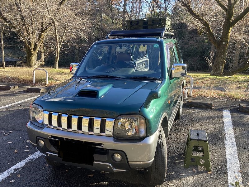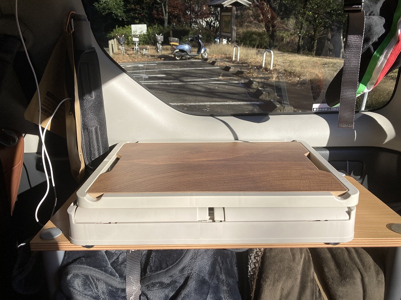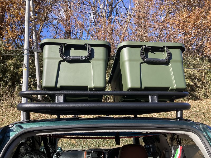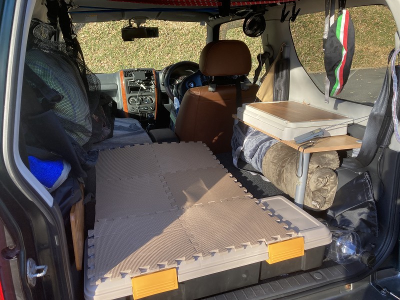 ラゲッジボックスはルーフラックに載せておきます。この状態で普通に座ってもルーフに頭はつかないのでJB23はそれなりの高さがあるんですね。調理したりパソコンしたりする分には何の不自由もないでしょうね。