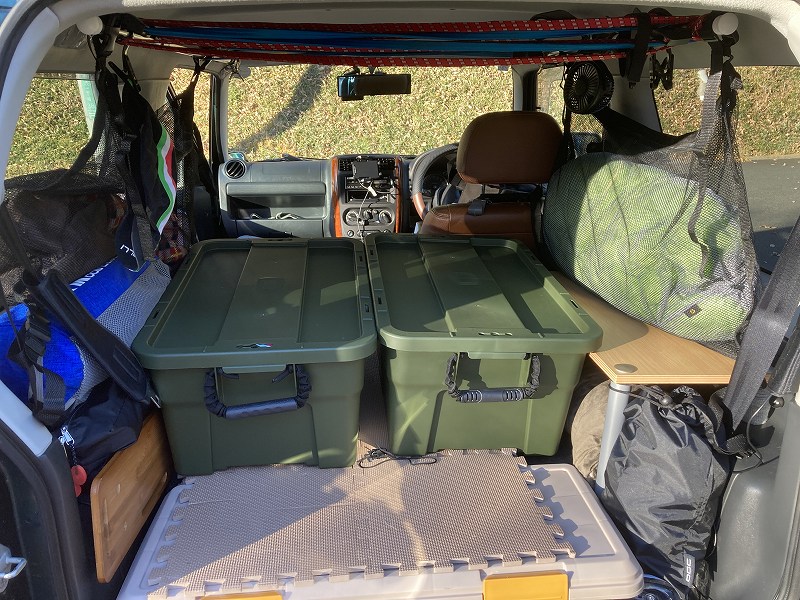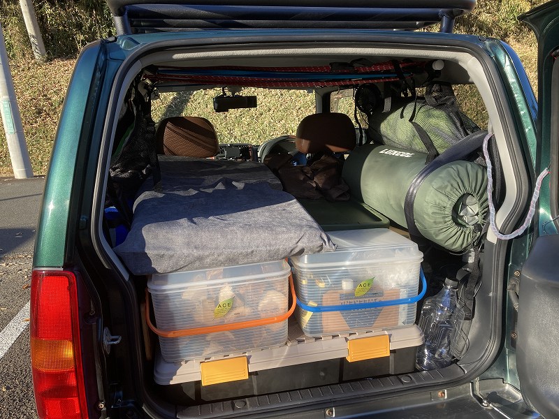 通常はこんな感じで。ラゲッジに並んでます。手前の薪と調理器具を入れたコンテナを下ろして、リアシート座面を助手席において車中泊ベットを作ったらこんな感じです。(これにインフレータブルマットを引くけどめんどうなのでやりませんでした〜)