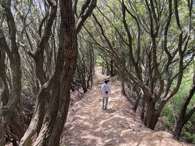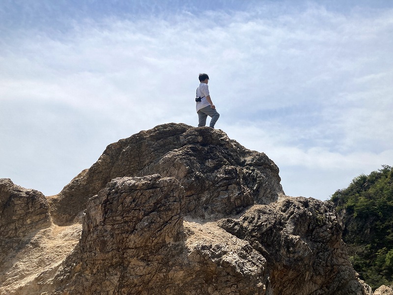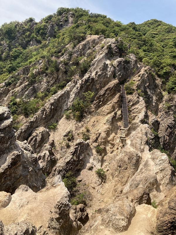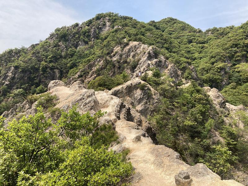 思っていたより両側の崖が切り立っていて、バイクの教習にある一本橋のような感じです。花崗岩が風化した岩場なのでズルズルと滑る感じなので登りと下りは両手で岩場をつかまないと落ちそうですね。