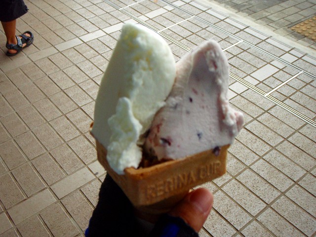 P9110334道の駅八千代で(朝から)ジェラート休憩!ジェラート屋さんは9時ごろからなので閉まってても少し待ちましょう!もう少しでパスするところでした。サクランボと梨のダブル!美味しかった〜