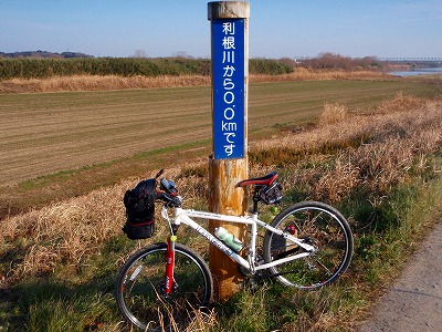 気を取り直して、おやつポイントに向かいます(笑)。路地をくねくね行くと進みダートの土手に復帰しましたが、利根川と鬼怒川の合流地点と教えてもらったので、鬼怒川0.0キロの看板を撮影しに行きます。