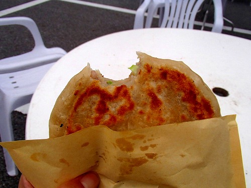 僕は「ハリオン」の前に出店していた「龍凰の中国おやき」が気になってしょうがなかったので、粉モン続きだけど買ってしまいました。それも2枚も!実は、このお姉さんが丸めている白いのが豚まんだと思って、豚まん買いに行ったら、目の前でペッタンコにされてました(笑)このおやき、豚まんをペッタンコにして焼いたもの(そのままだけど)の味ですが、すっごく美味しいです。JBFの定番がもう一つ増えました。(あ!今度は僕が食べてしまった)