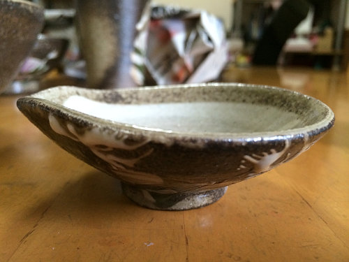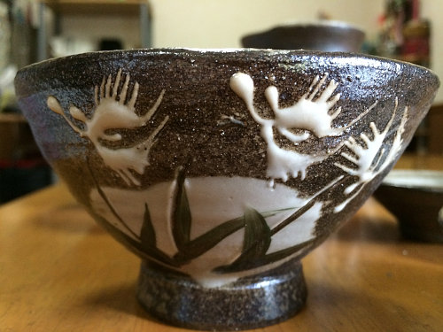 そして、この時にし紹介していた益子焼ができあがってきましたので紹介します。模様はサギソウをお願いしたのですが、なんだか顔に見えますね(笑)