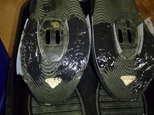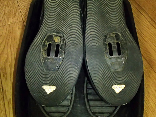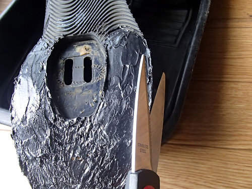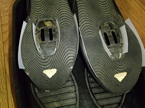 まず、クリートを外して靴を綺麗に掃除します。今回は完全にお湯に漬け込んで噛んでしまっている砂や泥も掻き出しました。結構汚れているもんですね〜。その後、一週間ほどは放置して乾燥させておきます。すっかり乾燥したサイクロンのソールにプラスティック板を貼り付けていきます。