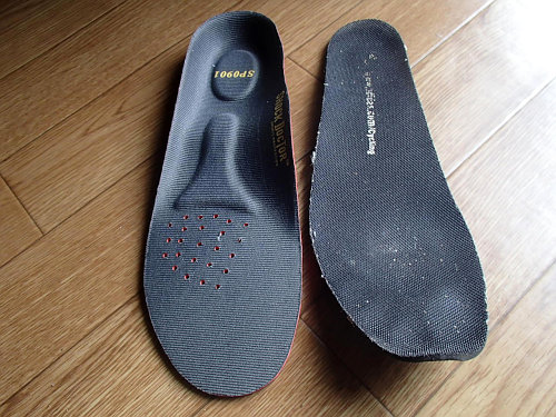 最近はちょっとブカブカ気味で、穴が合いてきてたので寿命かなぁ?なんて思っていたのですが、「ショックドクター」を使うといい感じに復活してくれたので、ほつれも修理してしまいましょう。左がショックドクターで右が純正のインソールです、かなり薄くなっていたのでブカブカでしたが、厚めのショックドクターで復活です。