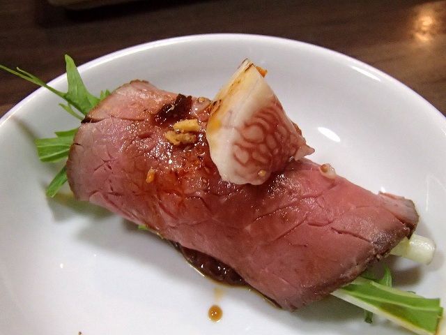 次はロースとビーフ??と思いましたが「牛のたたきのニンニクソース」です。上に載っているのは旬のイチジクですね。僕はイチジク、、匂いは好きだけど果物としては食べられないのですが、、、これ美味しかった!ちょっとした甘さと牛肉の愛称はいいんでしょうね。