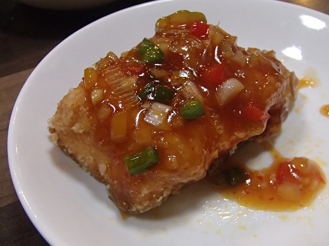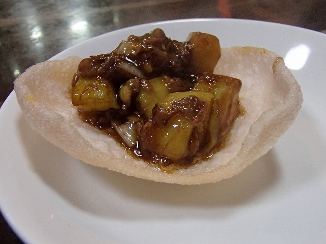 甘い炒め物を揚げもちに乗せて食べるのですが、これも美味しい!