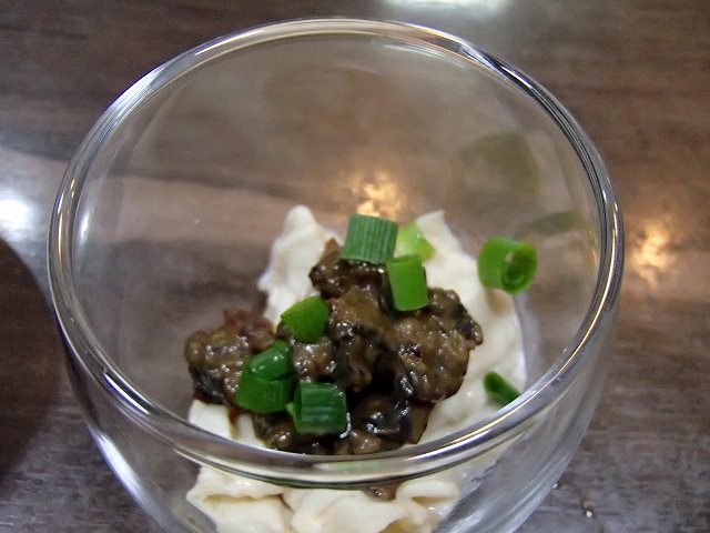 こちらは、クリームチーズのキャビアのせかと思いましたが、「湯葉の皮蚕ソース」って蚕(カイコ)??怖くて聞けなかったです(笑) あ!ピータンだったんですね(笑)