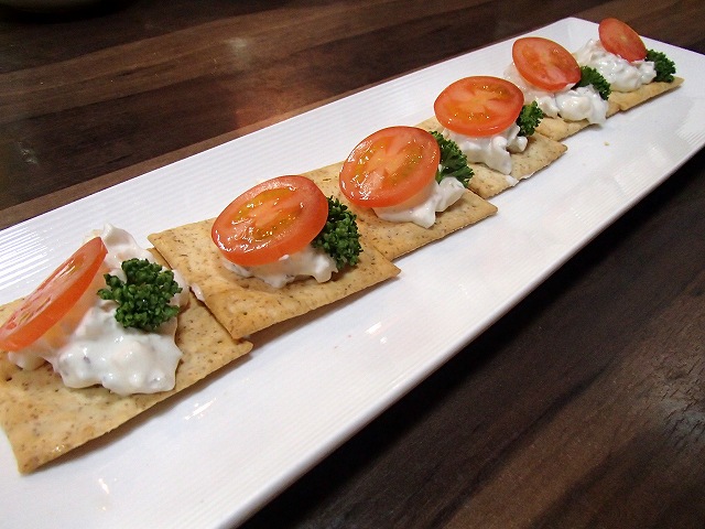 そして宴会スタート!いきなりイタリアン??盛りつけがかっこいい!今回もおどろきの連続になりそうです。そういえば、この「え!どこ行くの?」的な驚きは東葛ポタ(東葛人的ルート)と同じ楽しみがありますね。これは、「柿と搾菜のチーズ和え」ですが、クラッカーとトマトと一緒にカナッペになっていて、チーズの風味が美味しかったです!