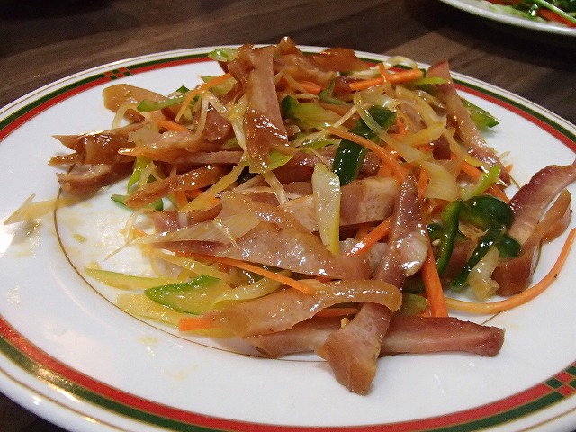 と思ったら、、、ここからも驚きは続きます。出てきた料理はミミガーかな?「豚共(漢字がでない)嘴の辛味葱添え」って何??と騒いでいると奥さんが「そのもの」を持って来てくれました。(びっくりして写真撮り忘れた、、、)