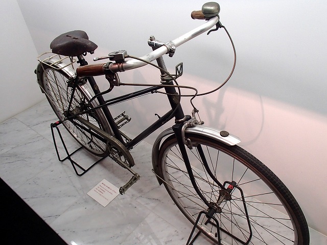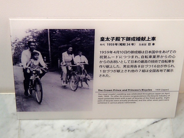 館内には堺市が献上した自転車が展示されていました。上皇様や美智子様が乗られた自転車もありました。阪急マルーンのようないい色の自転車で皇居の中をサイクリングされていたのでしょうか?タイヤにもマークがついていて特注のようです。