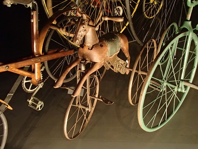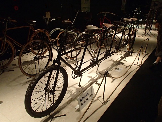 自転車の歴史コーナーですね。定番のドライジーネもありますが、ちょっと面白いものも並んでます。タイムボカンに出てきそうな自転車ですよね。5人で5倍のスピードがでるのかな?