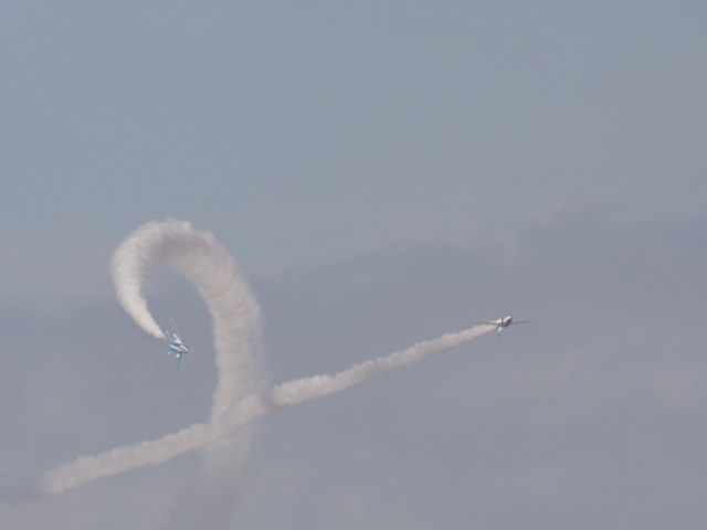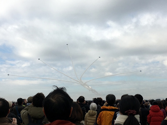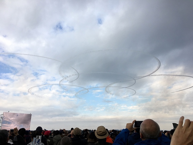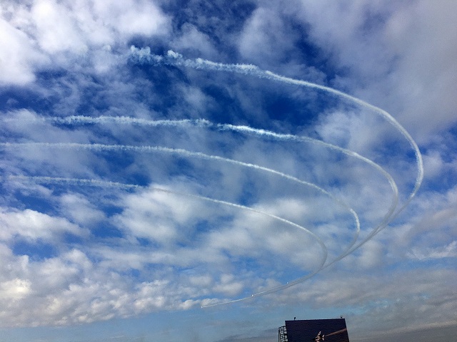 ブルーインパルスはスモークでいろんなことをしてくれます。今回もいろんな絵を描いてくれましたね。今回はまっちさんが無線を聞きながら見ていたのですが、高度を調整したり、技をキャンセルしたりするパイロット同士の会話が日本語でやりとりされているようで面白かったそうです。