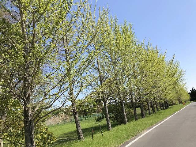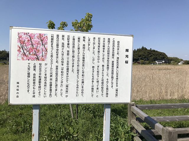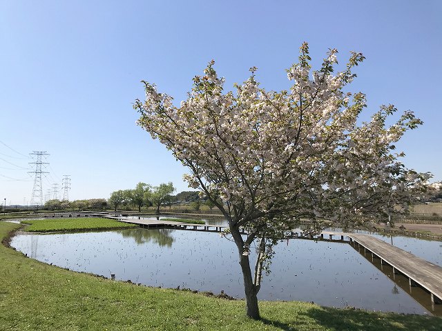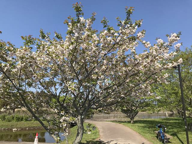 陽光桜はまだ咲いていませんでしたが、白い八重桜がきれいに咲いてました。ハスの花の季節にはきれいでしょうね〜。陽光桜は愛媛県の高岡正明さんが戦争で亡くなった方のために作った桜なんですね。しなまみポタで訪れた伯方の塩の初代社長さんです。