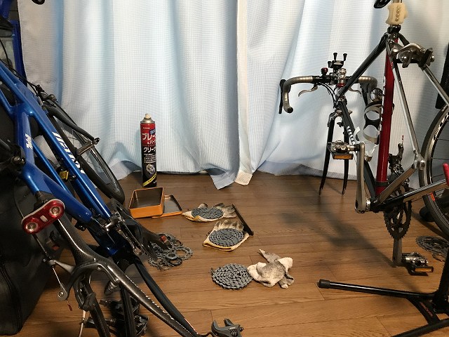 フレームをコーティングするときはチェーンを外すので、3台ともチェーンをきれいにしておきましょう。3台ともミッシングリンクを付けてあるので外すのは簡単ですね。