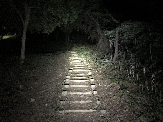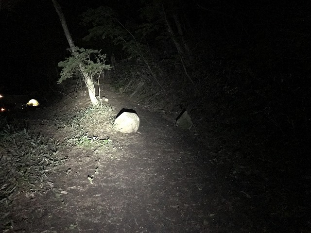 焚火も燃え尽きるのを待つだけになったので、いろいろ荷物を片付けて使わない荷物を担いで車に戻してからトイレを済ませてきます。階段には電灯がないので、ヘッドライト必須ですね。白い光にしていると虫が寄ってきたので、緑にすると来なくなりました。緑のライトはスマホカメラには映らないんですね〜(という事で白にしてから写真を撮る)