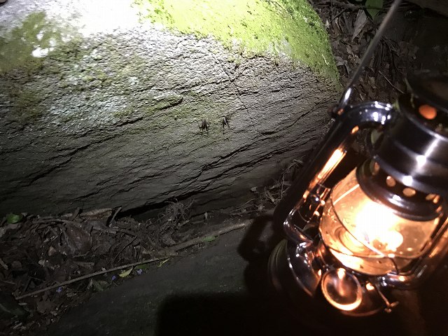 酔っぱらって来たのかランタンでちょっと遊んでました。真っ二つに割れた大きな岩がテントの後ろにあるので、そのあたりで遊んでました。コオロギみたいな虫がいっぱいいてちょっと気持ちが悪いけど、雰囲気はいいですよね。