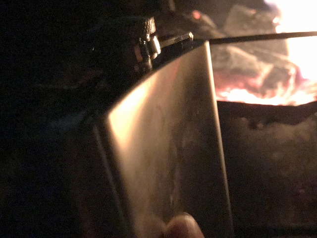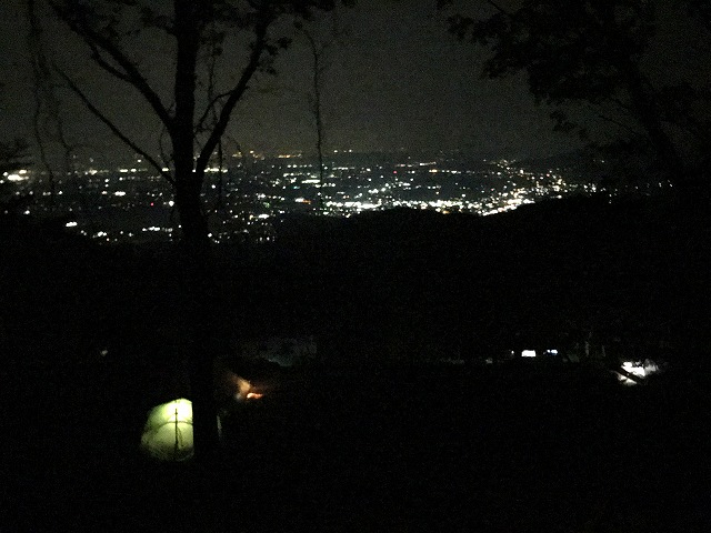 今回はスキットルにジンを入れて持ってきたのでチビチビ飲みながら焚火の番をします。焚火の火が落ち着いてきたので、街とテントの光だけの夜景もいいもんですね〜。クラフトジンが好きなのでいろいろ飲みますが、このクラフトジンはアルコール度数が40度で、夏にはロックでチビチビと飲んだり、冬はお湯割りにして飲みます。ストレートは、結構きつくて飲むというよりはなめる感じですね〜