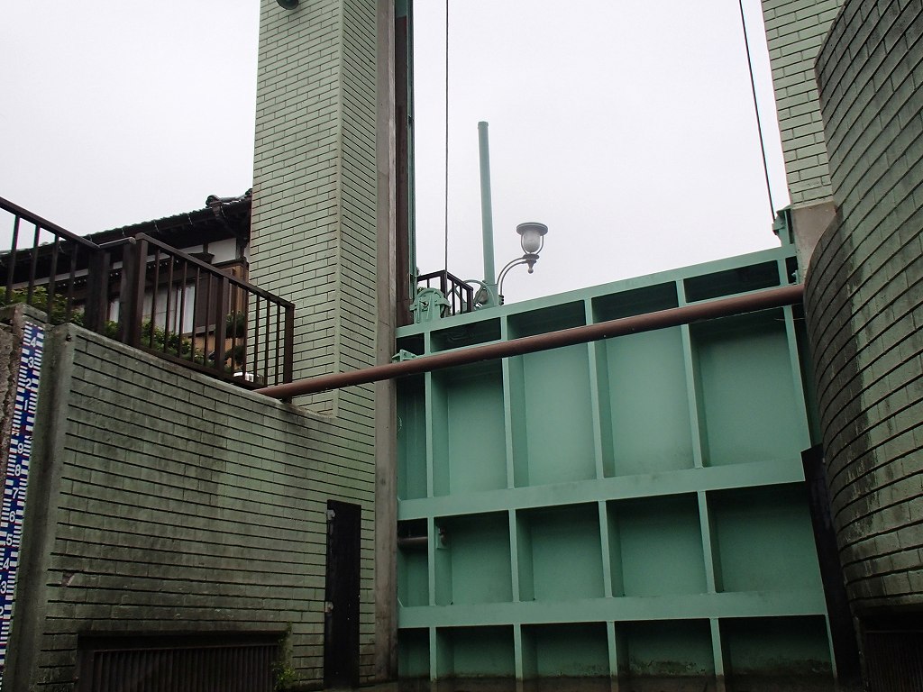 加藤洲にはいると少し狭くなってきてコンクリートの橋がでてきますが、水道管もついてる橋でした。遊覧船がいっぱい行きかうのでカーブミラーもありますね。さらに細い水路の「十二橋めぐり」をしながら到着したのが「加藤洲閘門」です。