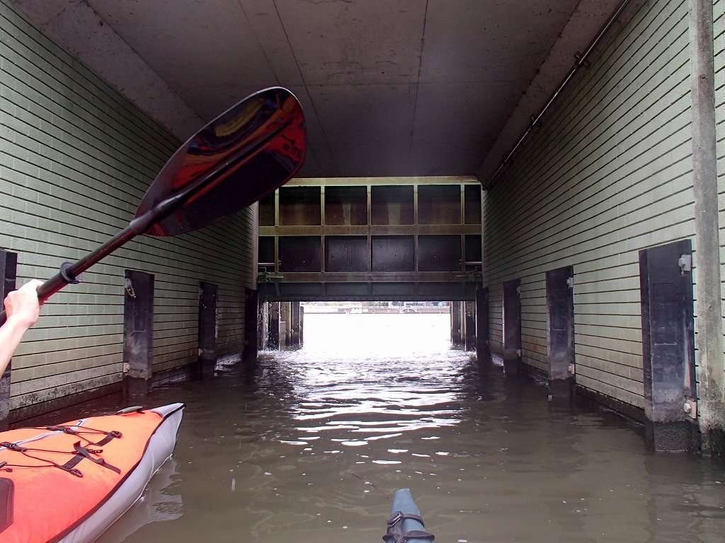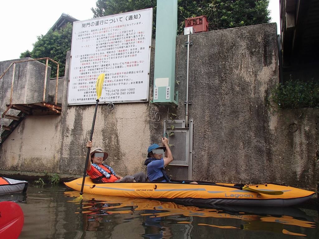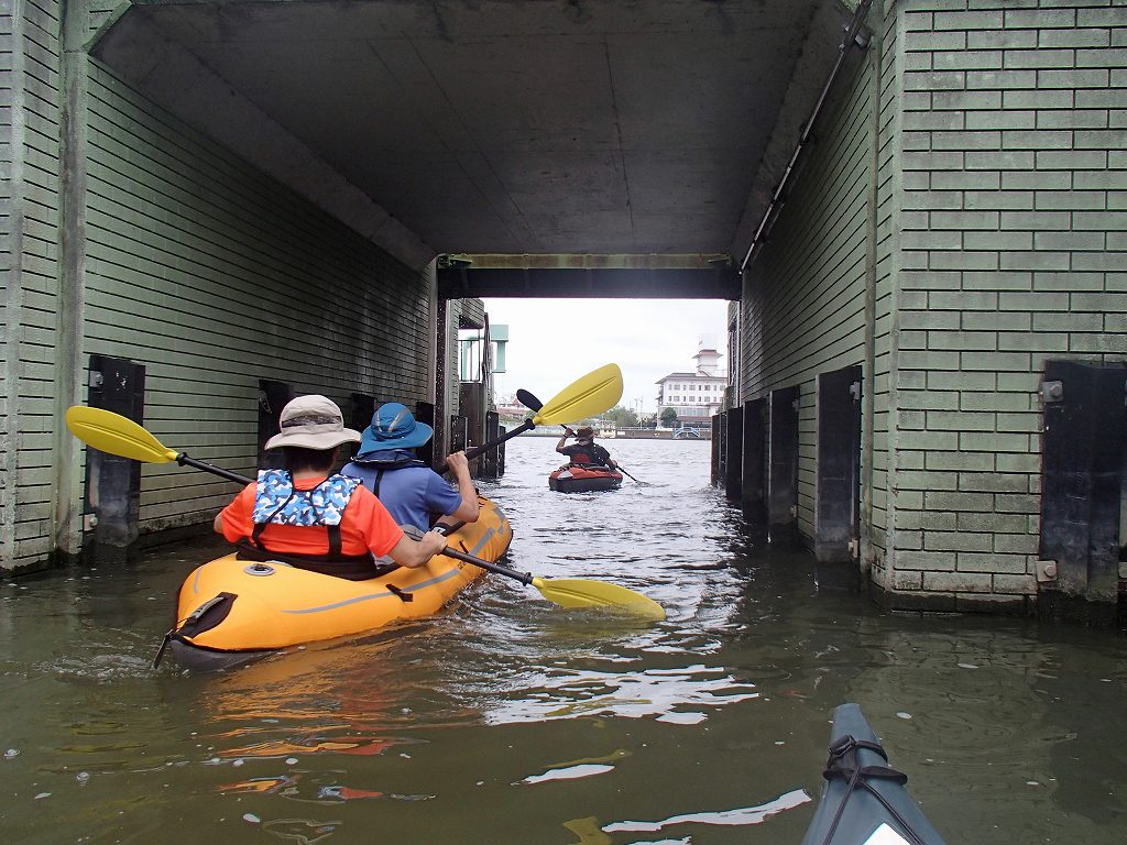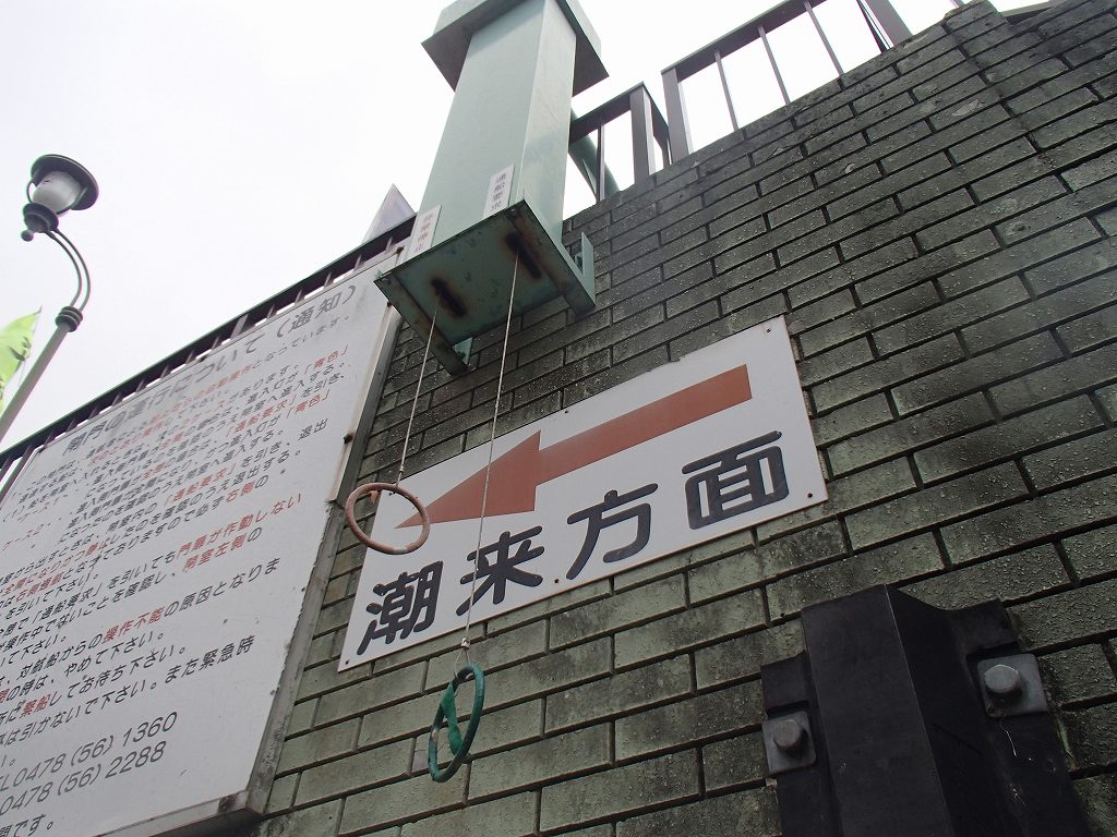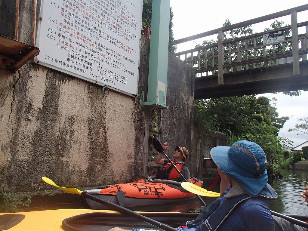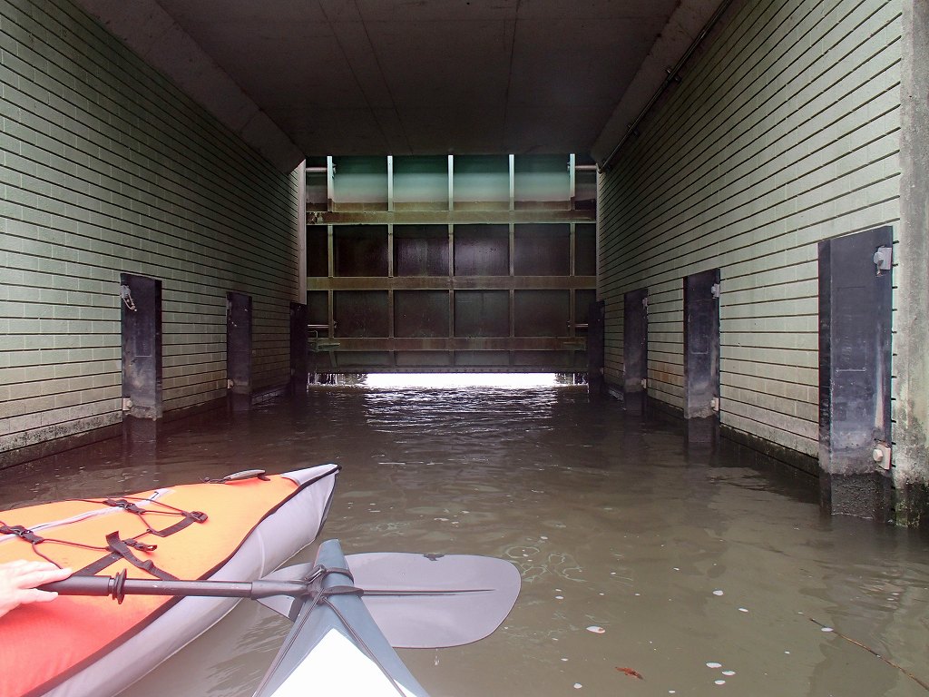 入れ替わりに閘門内に入って、今度は僕が引くと進行方向から水がどーーつと入ってきて見る見るうちに水面の高さがあがっていきます。向こう側にある常陸利根川に水面があったら門が開きます。もうサンダーバードの世界ですね〜