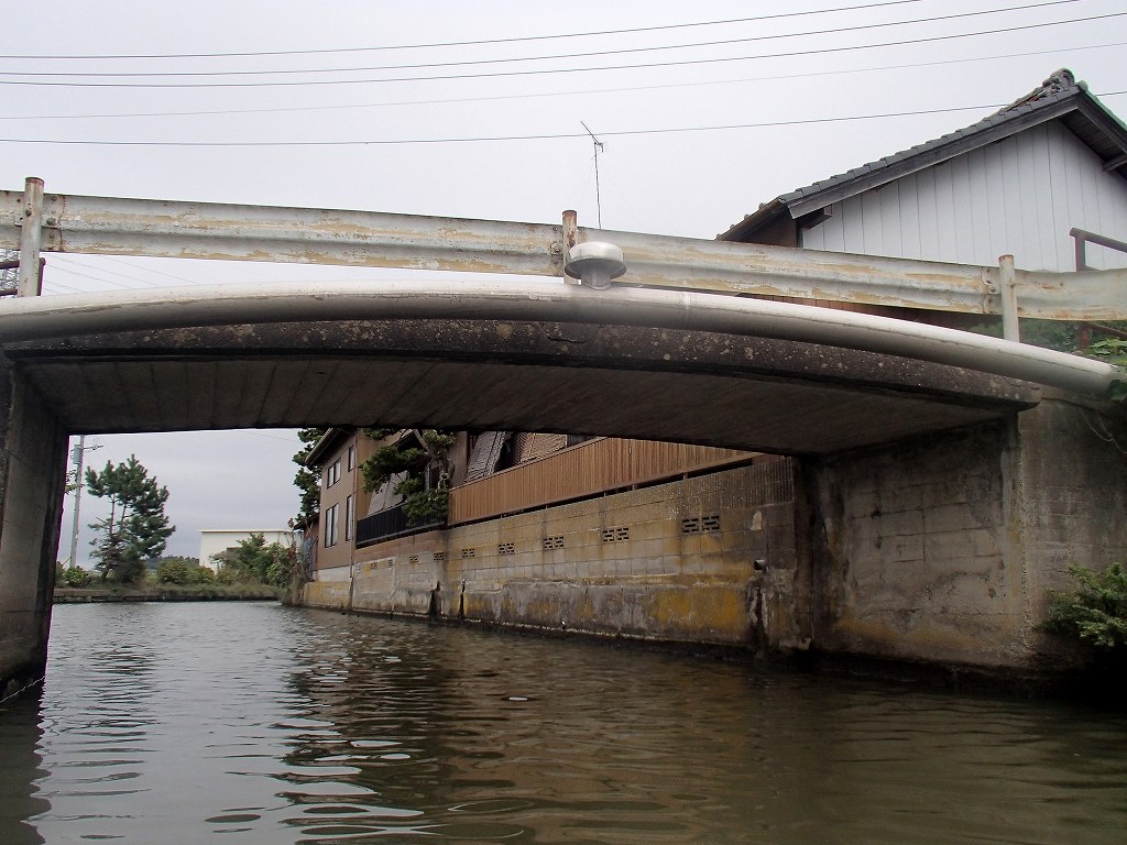 常陸利根川は広いけど、風がある割には波は少ないので、前川に入っていきます。前川は有名なアーチ橋や嫁入り船のでる「水郷潮来あやめ園」のところです。