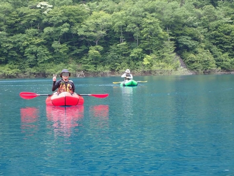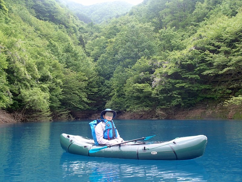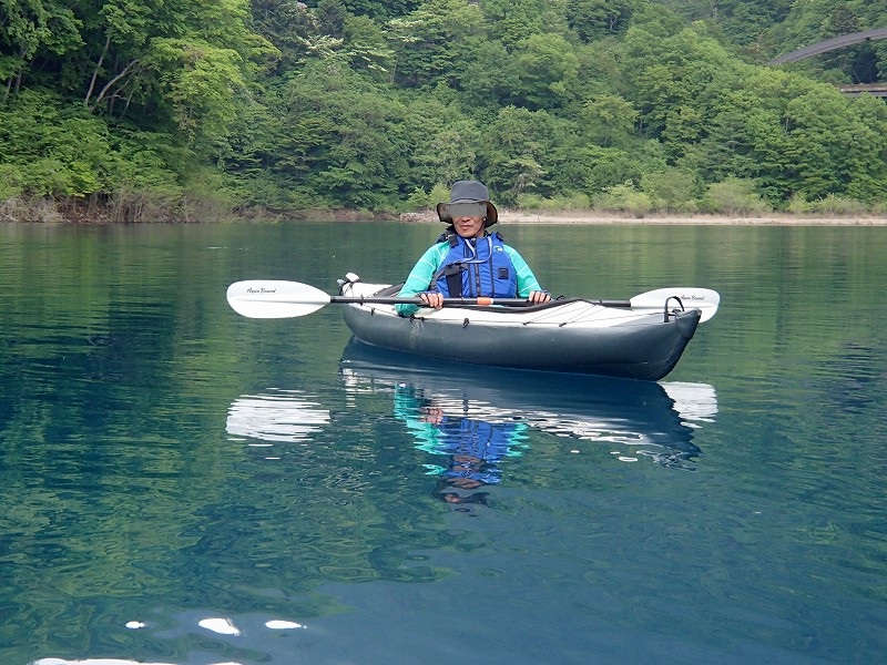 湖面に出ると四万ブルーの上にカヤックが浮いている状態になって不思議です。水がゆらゆらするとネオン管のように光って綺麗なんですよね〜。みんなの表情が穏やかに見えます。まだ、最初だしね、、。