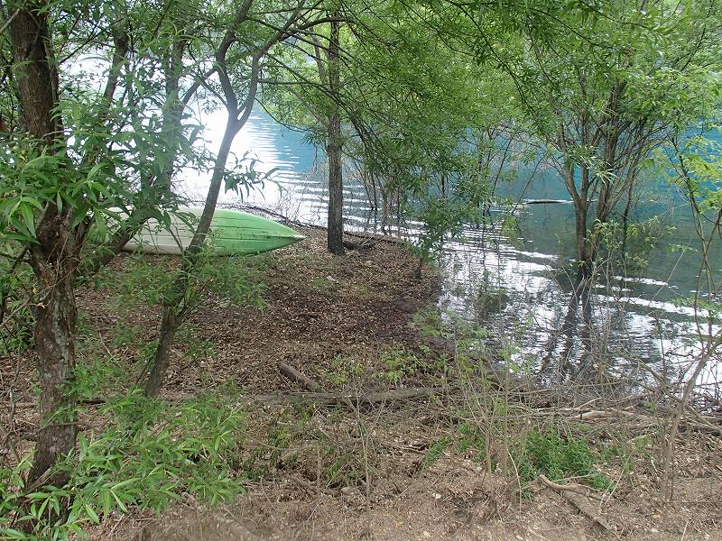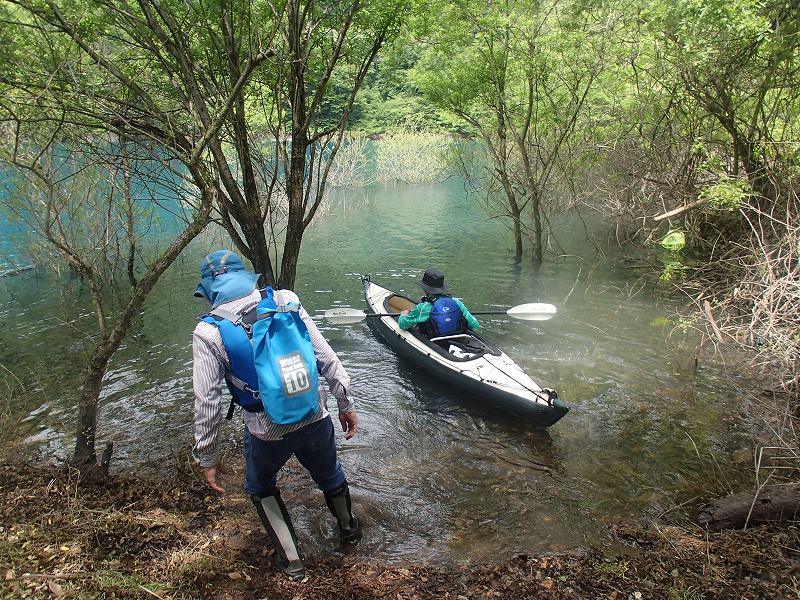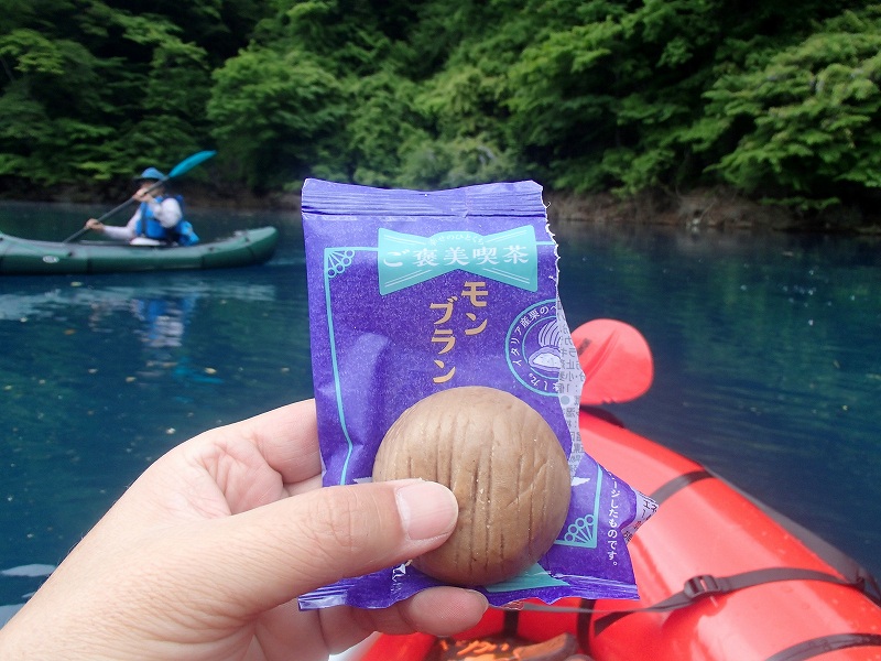 沢の先に上陸して、バーナーでお湯を沸かしてカップ麺を食べるつもりでしたが、管理事務所で「奥四万湖は上信越道高原国立公園内なので火気厳禁」と聞いたのでお昼はコーヒーだけ、みんなにおかきとモンブラン饅頭とグミを恵んでもらって助かりました〜。(今度からチョコレートくらいは常備しないといけないですね〜)