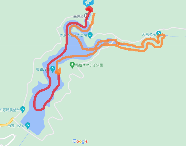 僕たちはこのコースで回りました。出廷場所からダムに向かい、追い風に押されながら左上のCM撮影スポット(青い丸)まで行ってから、右上の滝のあたりまで行ってから出廷場所まで戻ります。