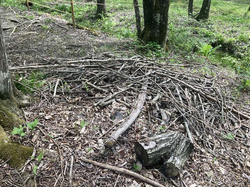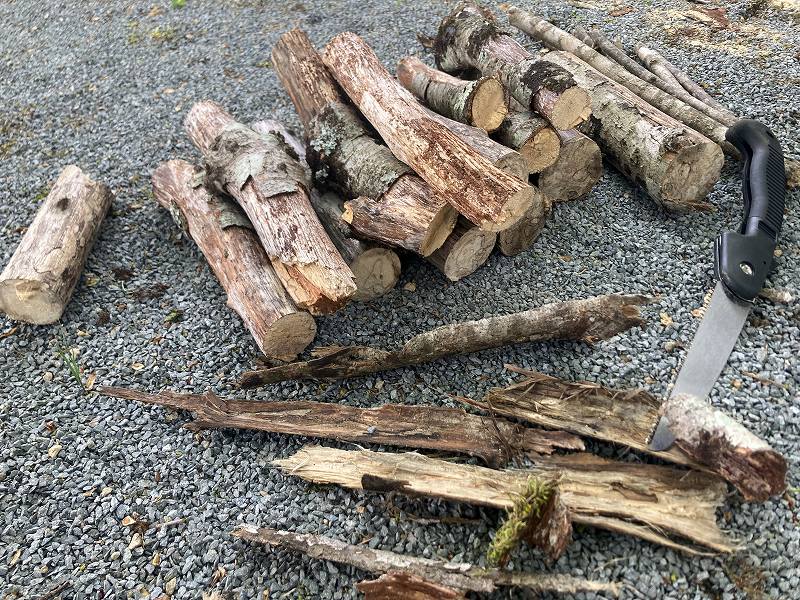 ここのキャンプ場は、集められた大小さまざまな枝が積み上げられている場所が数か所あったので、適当なものを拾ってきて薪にしました。太いのはノコギリで30センチくらいに切って、細いのは手で10センチくらいにして焚き付けにします。