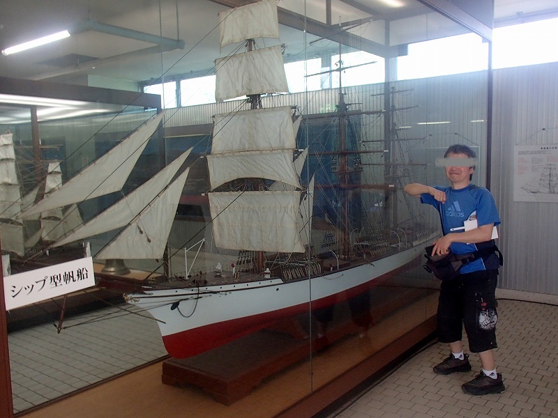 今日の目的は「百年記念博物館」です。船の模型やエンジンがいっぱい展示されていてで面白そうです。帆船にはマストの本数とかによって呼び方が違うそうで、シップ型やバーク型があり、これはシップ型帆船模型です。東葛人さんと比べると、、もう模型の大きさではありません。