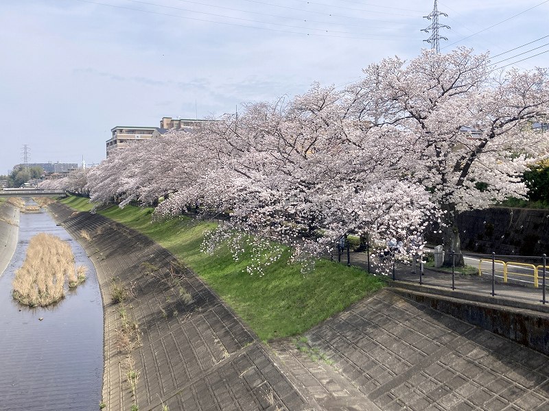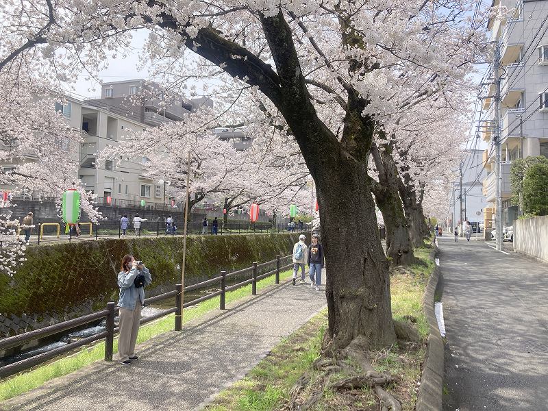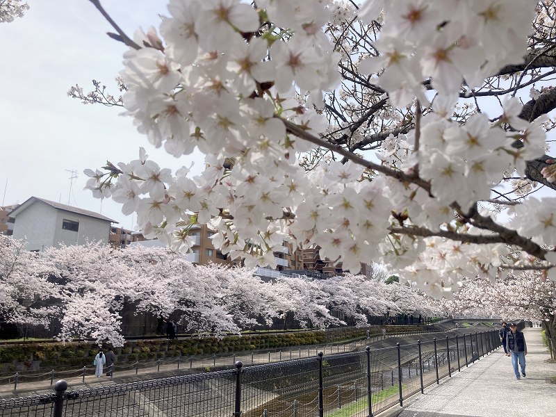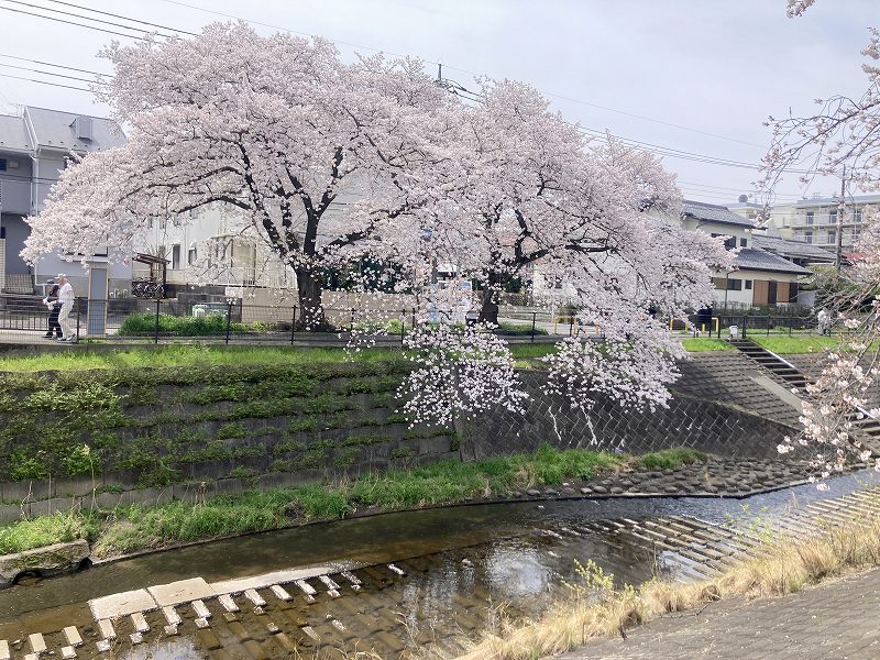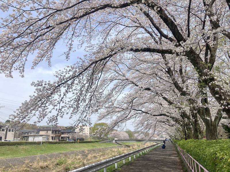 桜並木が長すぎるのでお花見の混雑もそれほどでもなく感じます。自転車で通過しても迷惑かけないくらいですね。河原に垂れ下がっているので座ってお花見する人とも通る場所が重ならないのでいい感じです。