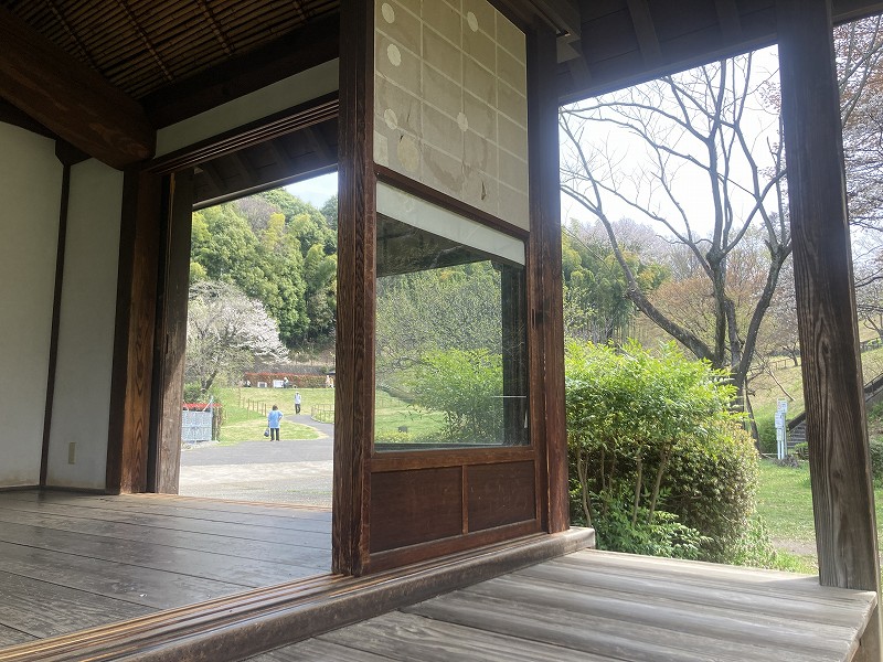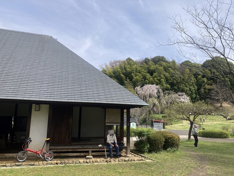 「川井家のしだれ桜」は「鶴牧西公園」にあるんですが、隣にある川井家の桜が寄贈されたようです。古民家風の休憩施設があるので縁側でのんびりできます。お弁当持ってきて食べていいよって言ってました。向こうに見えるのが枝垂れ桜です。