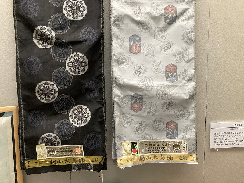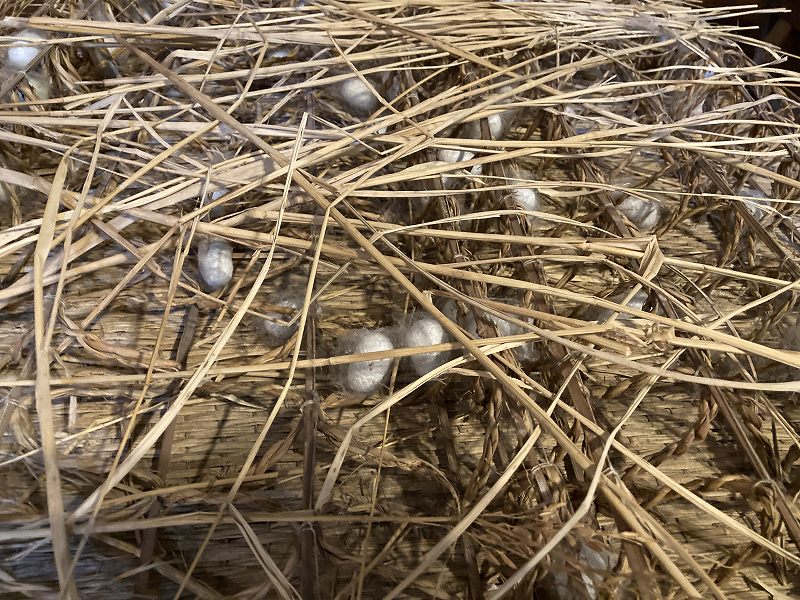 村上大島紬の糸は立川市の養蚕農家から出荷された生糸でできているそうで、この辺りは養蚕が盛んだったんですね。よくみる養蚕の展示もあったのですが、お祭り用か?_クリスマスツリーのように桑に真っ白な繭がいっぱいついている写真が展示されてました。養蚕の蚕は自然界にはいないので、真っ白い繭がこんな感じになるのは自然の姿ではないそうです。天蚕(天然の蚕)の繭はちょっと緑らしい。