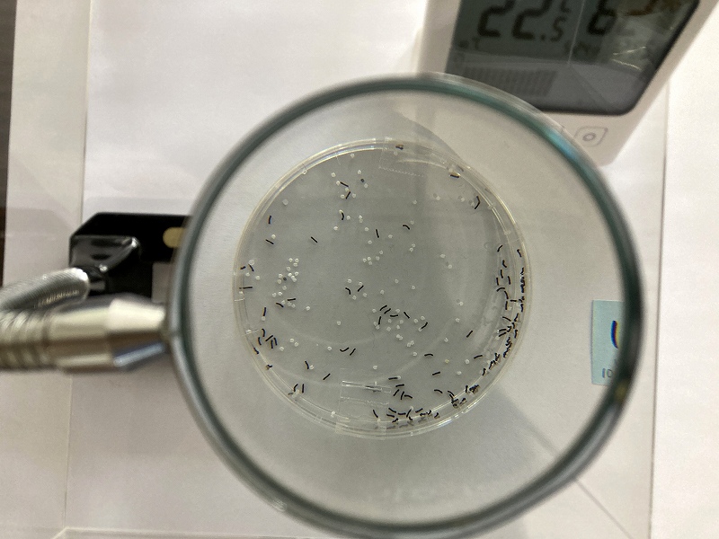 え?蚕の赤ちゃん?じっと見ていると動いてます。動画を嫁さんに送ったら「それは蟻蚕(ぎさん)っていう養蚕の赤ちゃんだよ」と教えてくれました。(大学で製糸関係の研究をしていたので詳しいです)