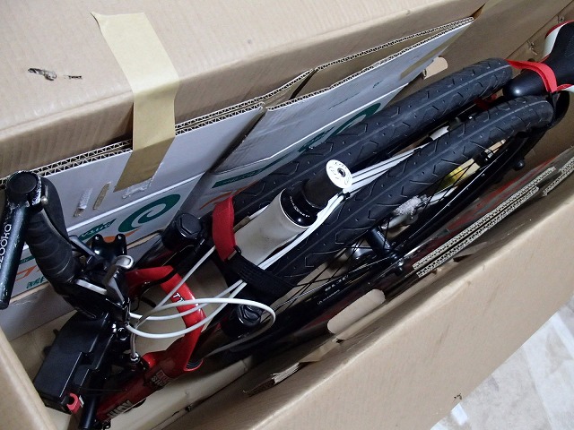 少しだけ試乗して問題ないようだったので、保管していたダンボールに梱包していきます。結構ギリギリだったのでハンドルも外しておきました。ちゃんと息子が組み立てできるかな?(わからなかったらTELしてくるでしょう。近くに町の自転車屋さんもあったし)