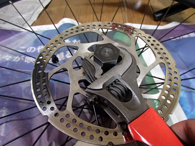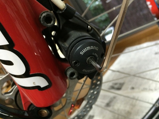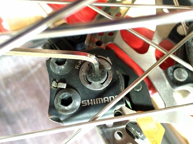 さあ、調整しましょう。写真のように内側(動かないほう)のパッドを調整するボルトを回してパッドをローターぎりぎりまで寄せます。