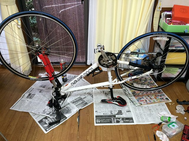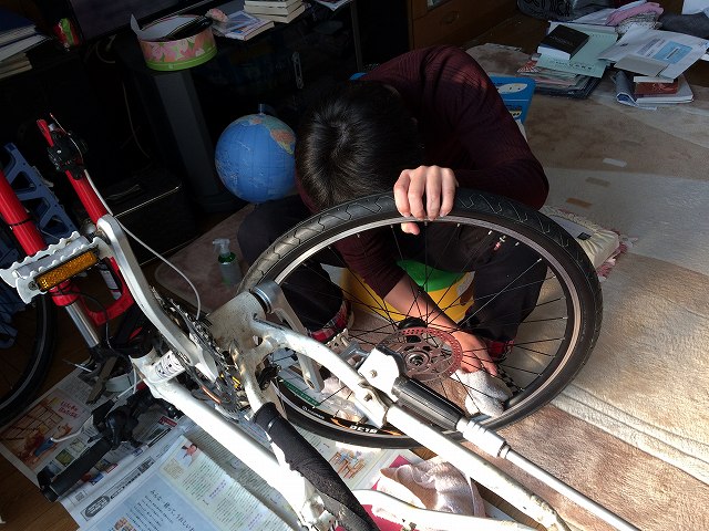 とりあえず、大掛かりなメンテナンスはしなくてもいいように軽いオーバーホールしておきましょう。まずは洗車ですが、これは息子に伝授します。700Cをはかせていたのですが、道が悪そうだったのでしばらくは26インチのボリュームのあるスリックにすることにします。