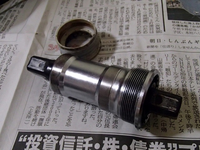 そして、BBも久しぶりに外してきれいにします。以前はBBが錆びて大変なことになったのですが、今回は汚れているだけだったのでクリーナーで綺麗にしてグリスアップしておきました。