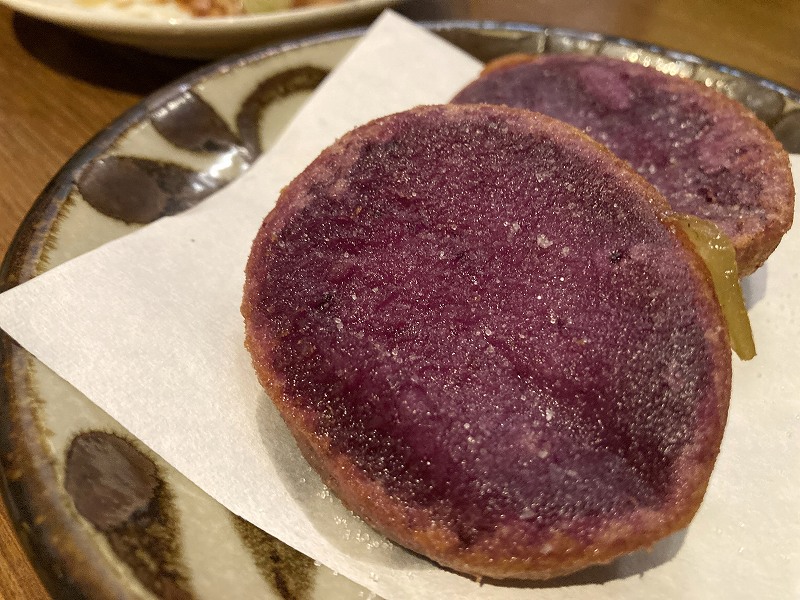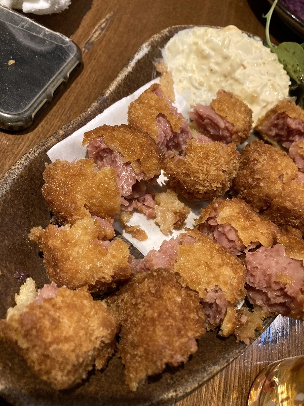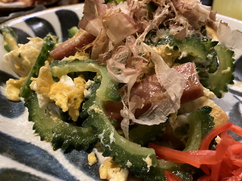 ゴーヤーチャンプルとスパムカツとうむくじ天ぷらです。ここのゴーヤチャンプルーは苦みとうまみがあっておいしいですね。スパムカツはタルタルとソースが付いてきますがソースがありますね。うむくじ、、聞いたことないな。と思ったら紫芋の粉を持ちのようにした料理のようです。甘くておいしかったですよ。