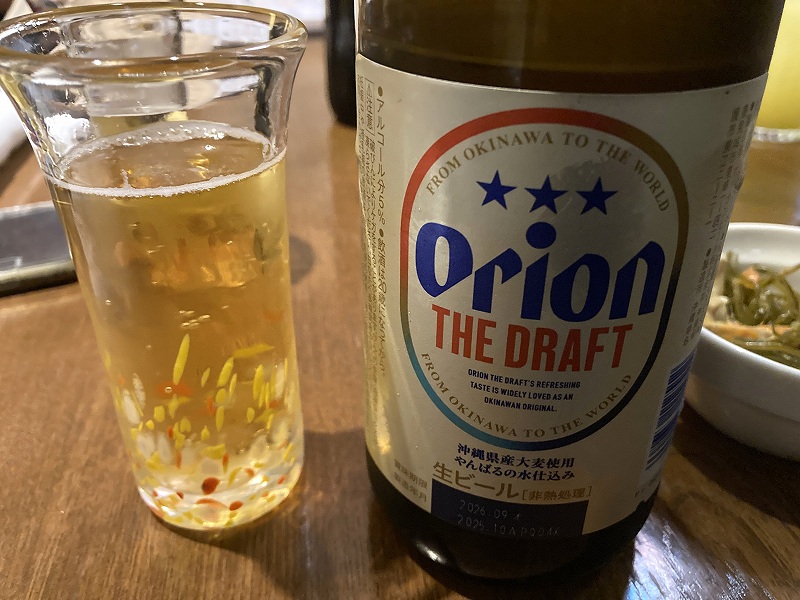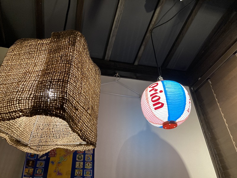最初はオリオンビールとシークワーサースカッシュで乾杯です。オリオンビールは普段飲まないけどおいしいですね〜。提灯が下がっているので沖縄のイメージです!