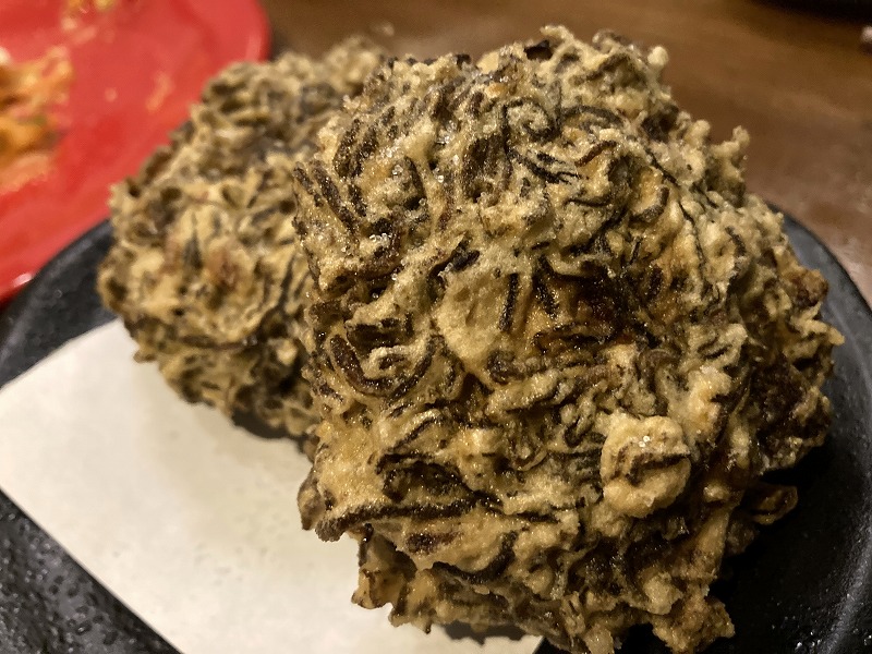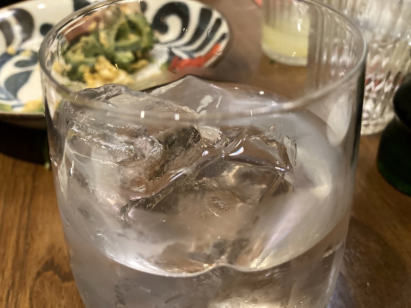 人参シリシリ(定番の方)ともずくの天ぷら(これも定番!)で次呑むものをみんなで選びます。僕は黒糖焼酎()のソーダ割にしました。れんとと違ってちょっと匂いが〜(笑)