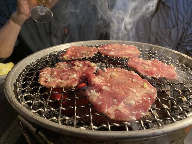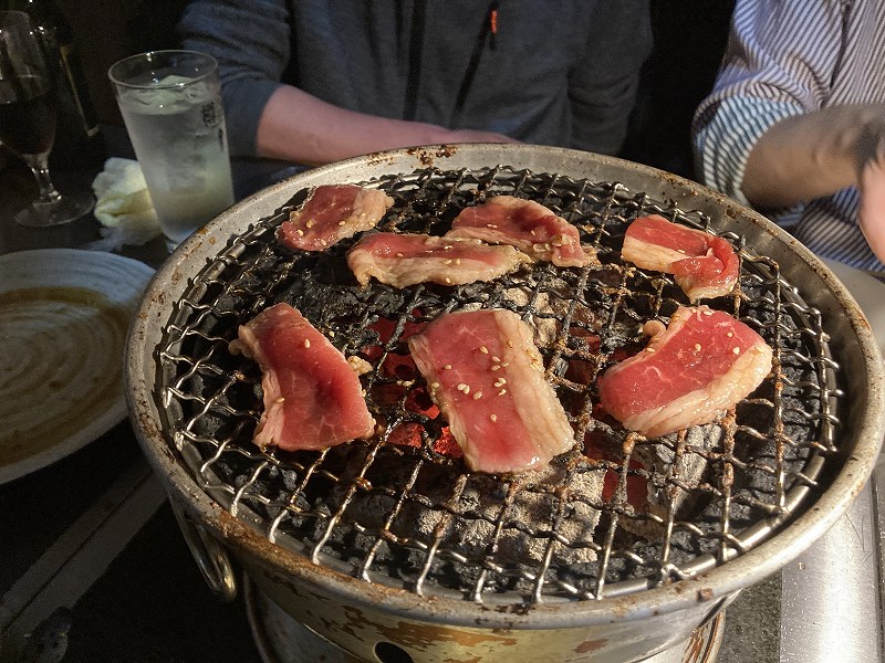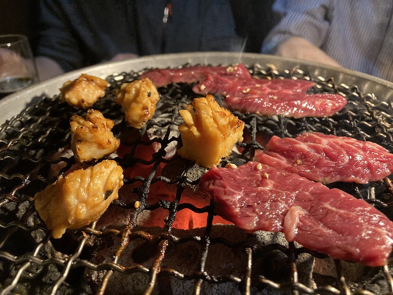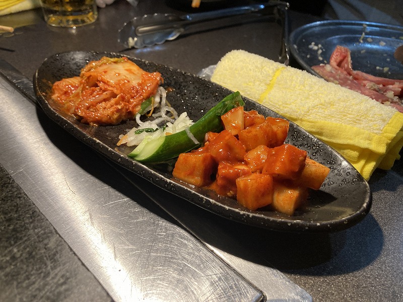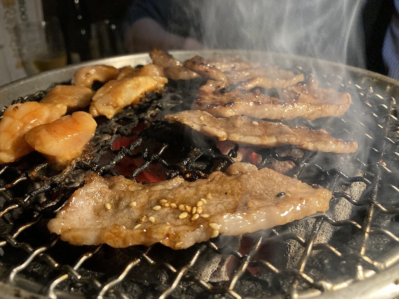 そして、100円の焼肉も行ってみよう!ということで焼酎ボトルと一緒に頼みました。値段によって違いはありますが100円のカルビもおいしいです!ま、酔っぱらってきたからわからないという話もありますけど、おいしいものはおいしいです。