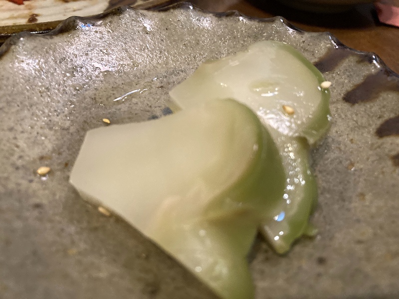 最後は泡盛(鯨という銘柄)のソーダ割にしました。すっきり癖のない泡盛おいしいです。つまみは生ザーサイの浅漬けと塩テビチの煮込みです。沖縄っぽくておいしいですね!